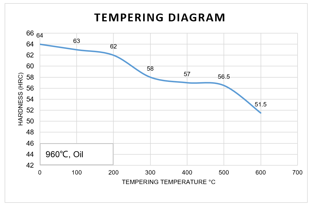 | Quenching °C | Tempering °C | Hardness - HRC | |